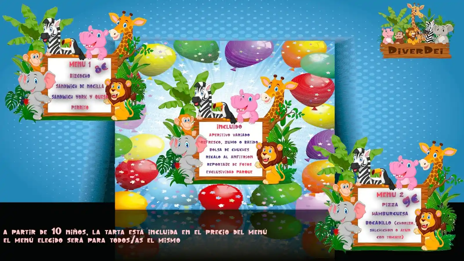Incluye 2 horas de diversión con todo organizado: menú infantil, juegos, tarta y regalos.